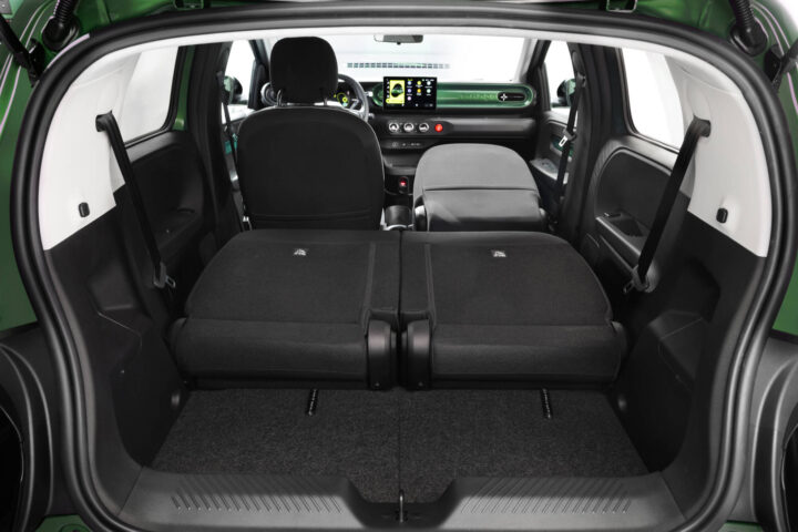 Trotz des Retro-Mantels ist das Auto ein reiner Stromer und kommt als praktischer Fünftürer auf den Markt. Im Innenraum bleibt der Twingo seiner Tradition treu: Er bietet trotz kompakter Außenmaße (ca. 3,79 Meter Länge) ein überraschend modulares Platzangebot. Die Rücksitze sind verschiebbar und umklappbar, wodurch der Kofferraum von 305 auf über 1.000 Liter erweitert werden kann.
